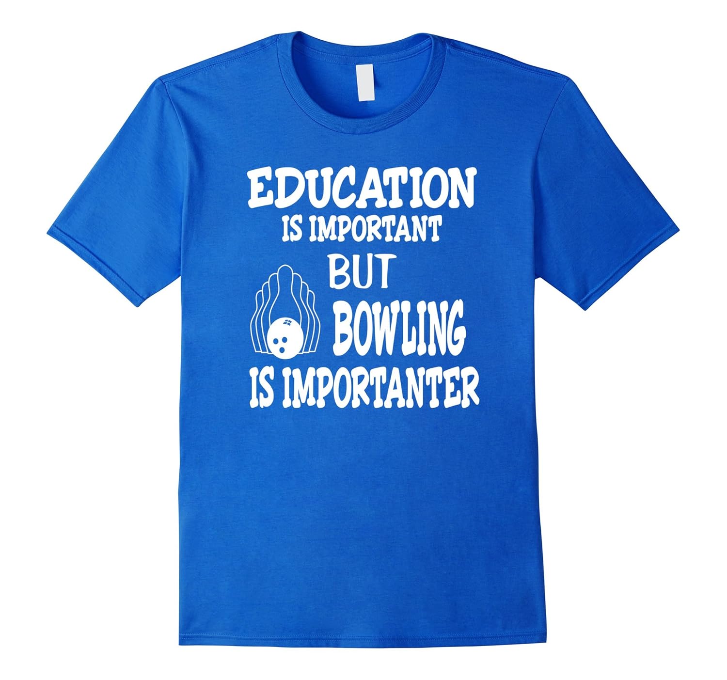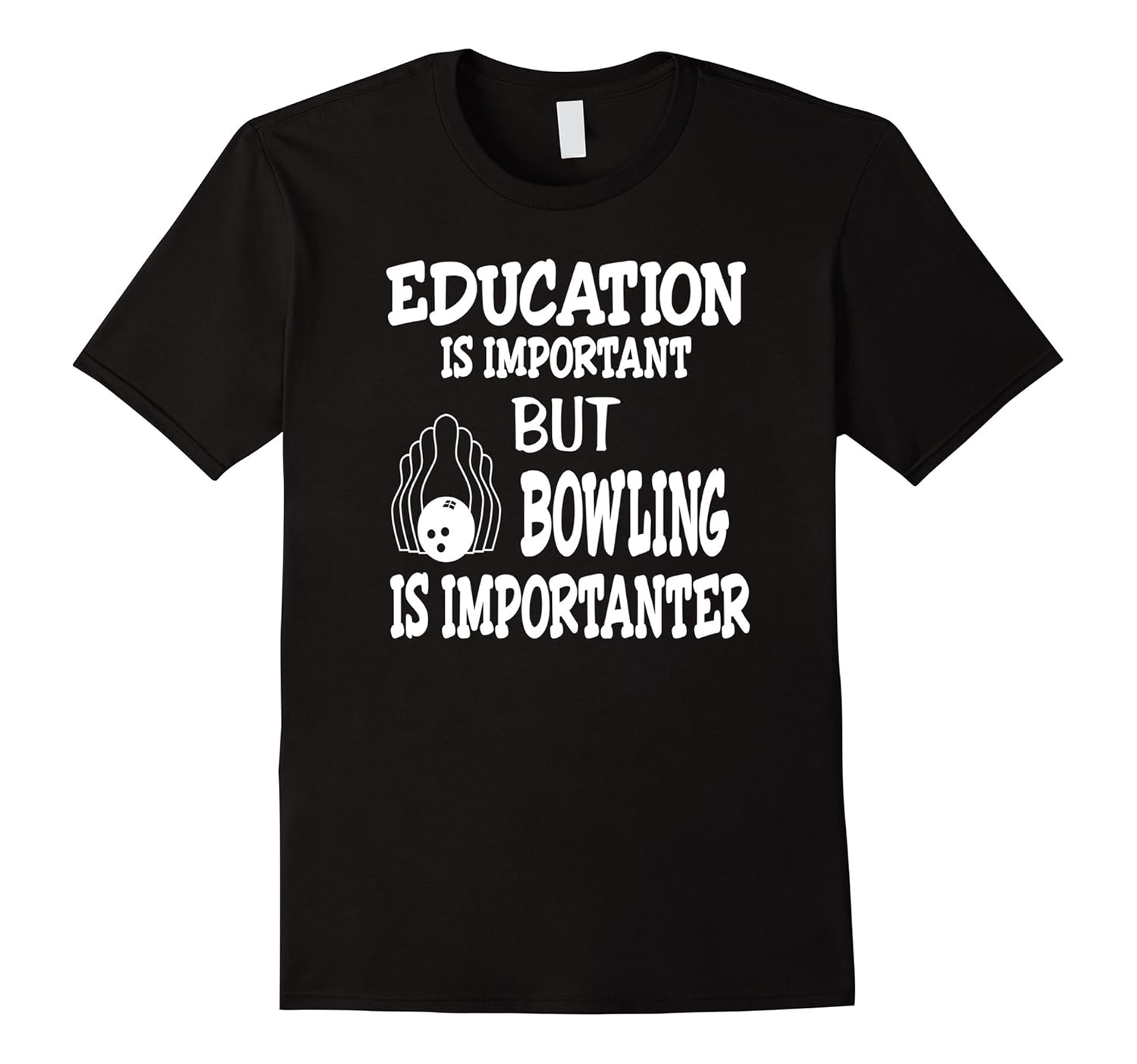 Solid colors: 100% Cotton; Heather Grey: 90% Cotton, 10% Polyester; All Other Heathers: 65% Cotton, 35% Polyester; Imported; Machine wash cold with like colors, dry low heat; Show your love of bowling and wear this funny Education Is Important But Bowling Is Importanter tee shirt. Get it for a Christmas present for your favorite pin-head, or someone who just likes to drink beer while they bowl!; Our Funny Bowling shirts print and run slightly fitted. So be mindful and order a size up to be safe. Now get out there and roll your balls!; Lightweight, Classic fit, Double-needle sleeve and bottom hem