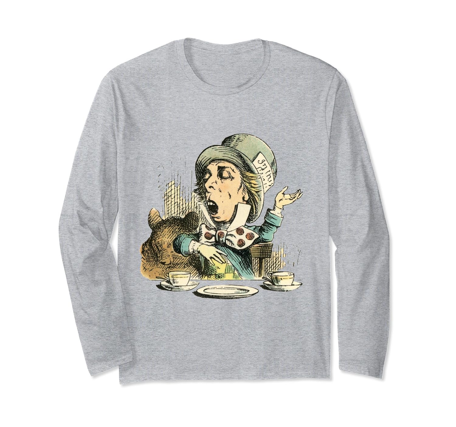 Solid colors: 100% Cotton; Heather Grey: 90% Cotton, 10% Polyester; All Other Heathers: 50% Cotton, 50% Polyester; Imported; Machine wash cold with like colors, dry low heat; Vintage Mad Hatter illustration from Lewis Carrolls classic Alice in Wonderland. Long sleeve t-shirt in unisex size for men or women.; Great gift for teachers, students, librarian, co-workers, friends, or anyone who loves these classic tales.; Lightweight, Classic fit, Double-needle sleeve and bottom hem
