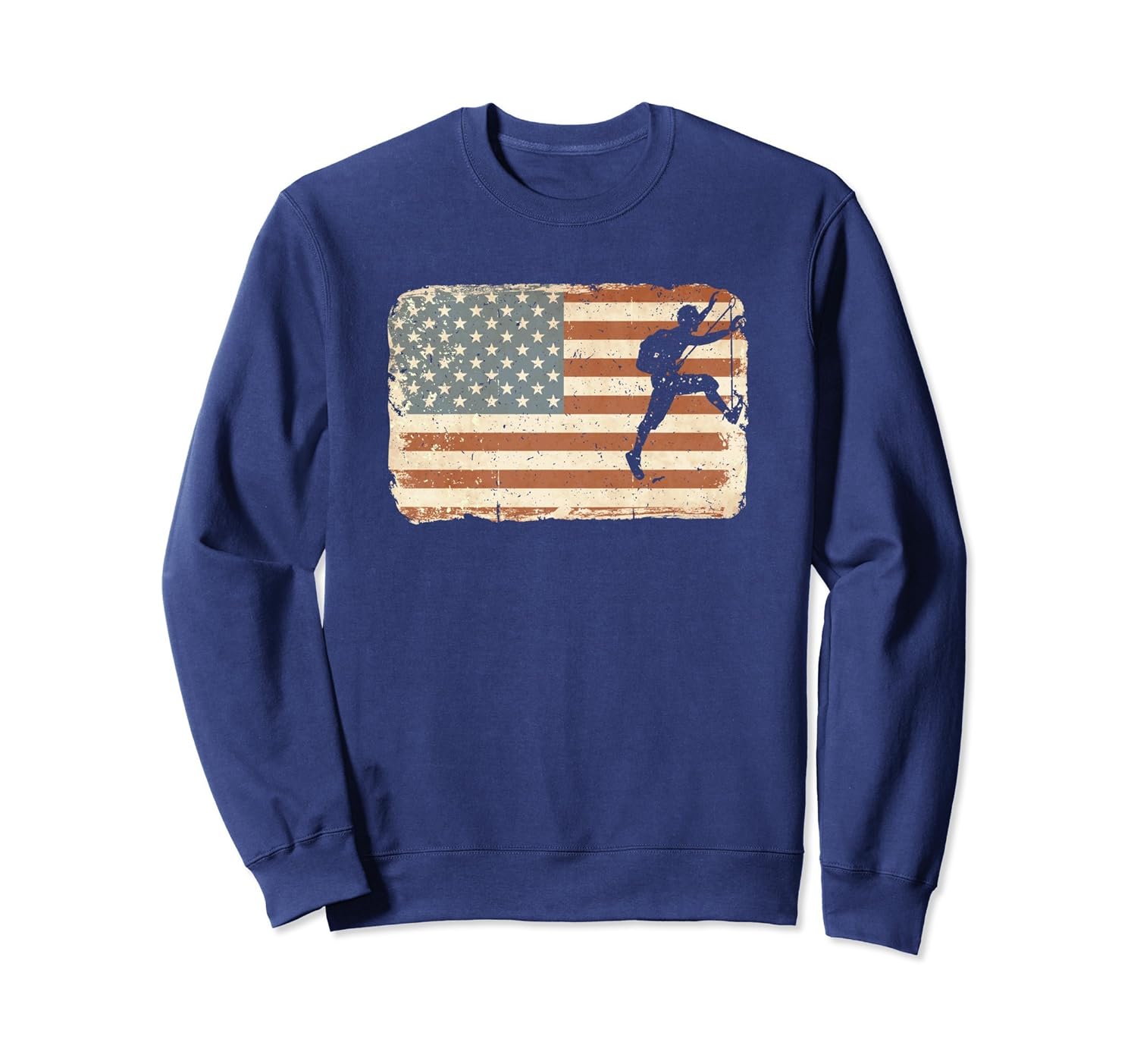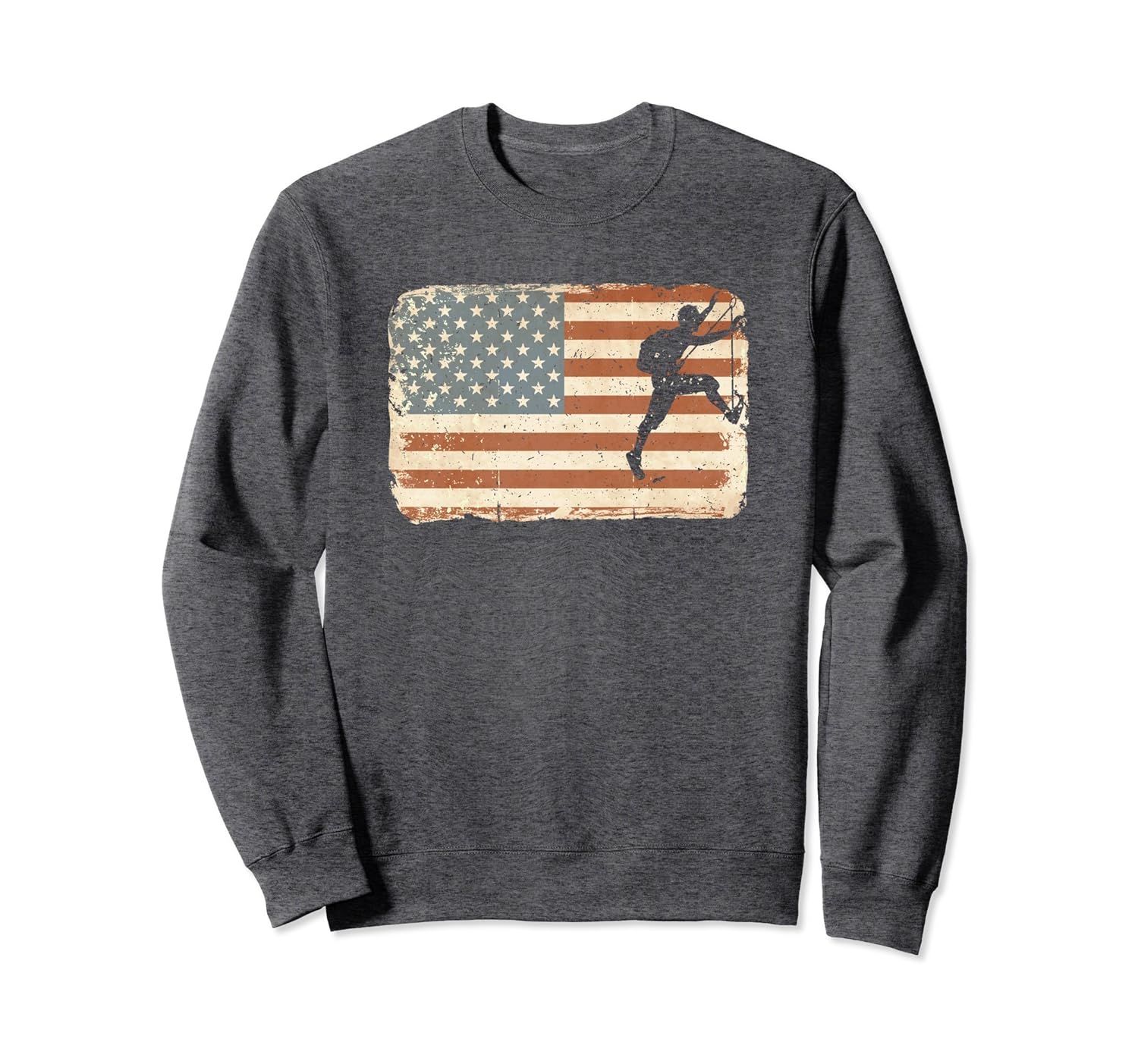 Solid colors: 80% Cotton, 20% Polyester; Heather Grey: 78% Cotton, 22% Poly; Dark Heather: 50% Cotton, 50% Polyester; Imported; Machine wash cold with like colors, dry low heat; This Rock Climbing pullover on a vintage American flag is the perfect USA sweatshirt gift for a patriotic rock climbers, mountain hikers in the US. Novelty graphic jumper for outdoor lovers who rock climb, hike, and camp. Funny July 4th gift.; Cool present for Men, Women and teens. Retro, faded and distressed grunge style silhouette and flag of America. Great for the Fourth of July 4th or any American pride holiday.; 8.5 oz, Classic fit, Twill-taped neck