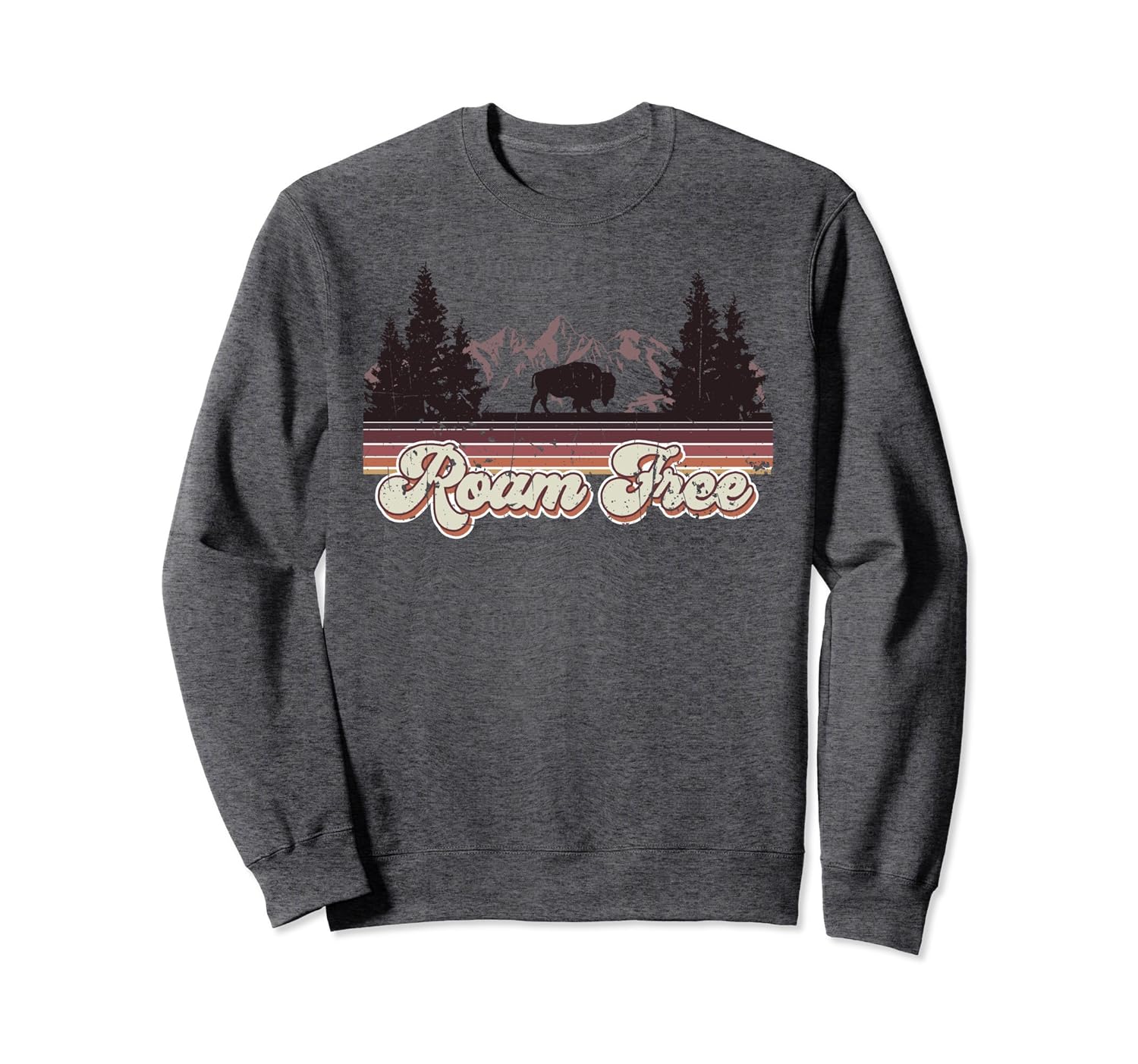 Solid colors: 80% Cotton, 20% Polyester; Heather Grey: 78% Cotton, 22% Poly; Dark Heather: 50% Cotton, 50% Polyester; Imported; Machine wash cold with like colors, dry low heat; Vintage retro design of 60s colors and Roam free with mountains, pine trees, and a buffalo. Roam free in National Parks, roam free in the mountains, roam free with the pine trees in the forest.; A crewneck sweatshirt for the rustic outdoorsy guys and girls who love to hike, camp, fish, climb, and be in nature and explore the great outdoors; 8.5 oz, Classic fit, Twill-taped neck