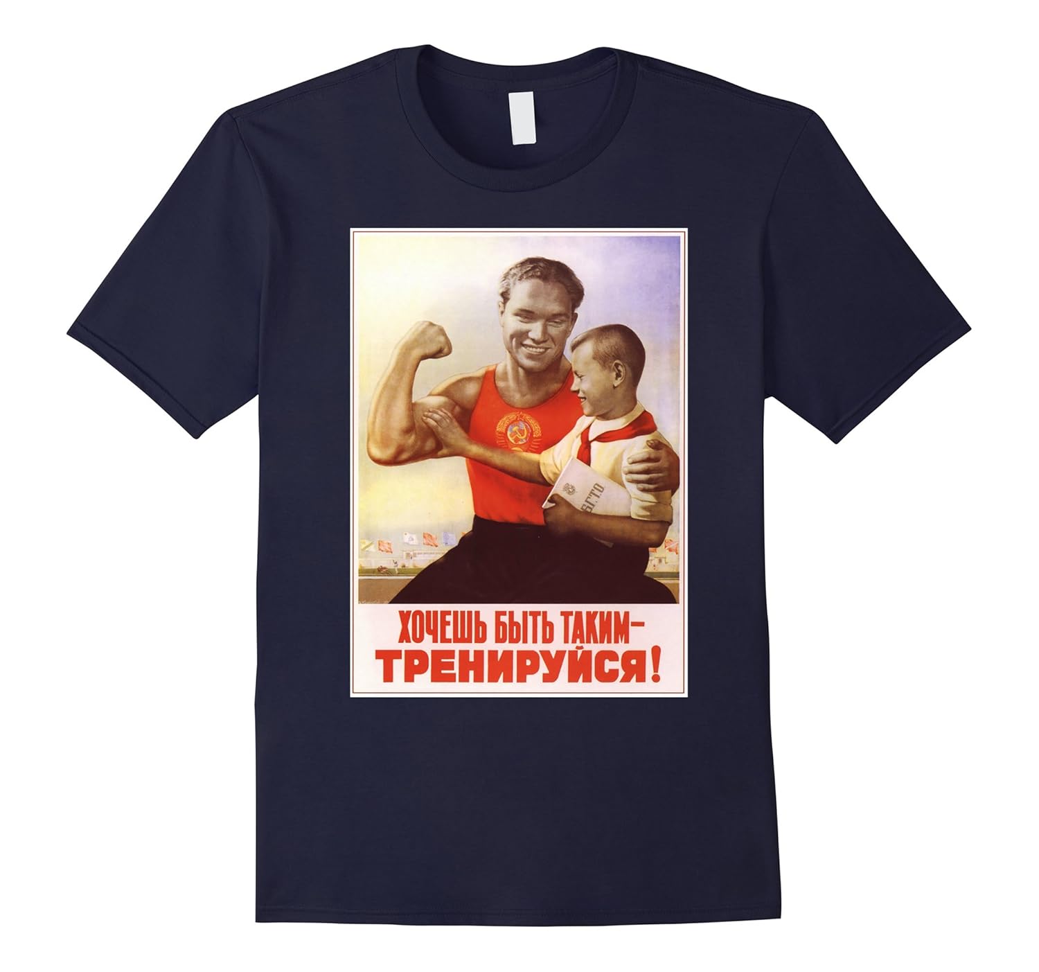 Solid colors: 100% Cotton; Heather Grey: 90% Cotton, 10% Polyester; All Other Heathers: 65% Cotton, 35% Polyester, Imported, Machine wash cold with like colors, dry low heat, Old Vintage Soviet Russian 50-s Poster With Strong Guy And Small Boy Touching His Biceps And Slogan In Russian meaning “If You Want To Be Like Me – Train!” Perfect For Gym Addicts And Workout Fans. Great Gift For Your Husband, Wife, Mom, Dad, Son, Daughter, Brother, Sister, Uncle, Aunt, Grandma, Grandpa, Nephew, Niece Or Just Anyone Loves Fitness, Bodybuilding, Strong Muscles And People With Sense Of Humor, Lightweight, Classic fit, Double-needle sleeve and bottom hem