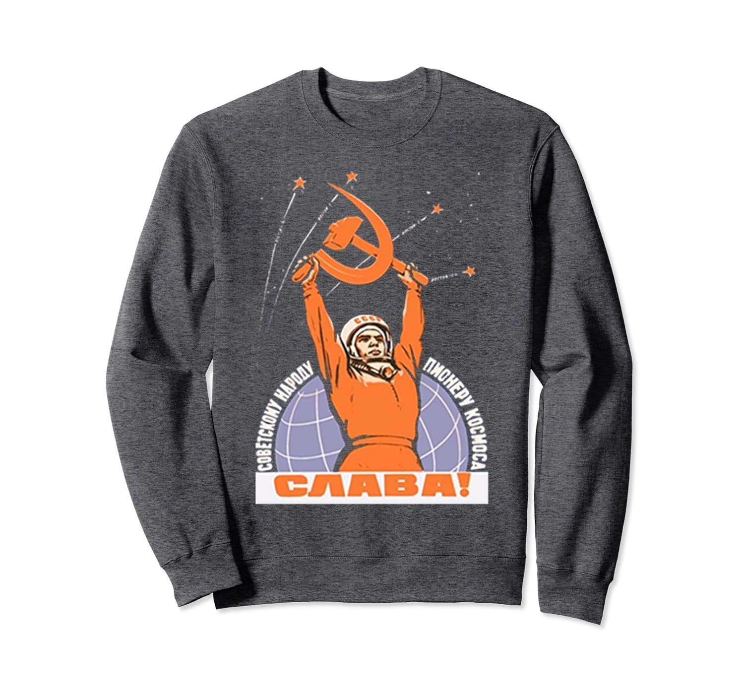 Solid colors: 80% Cotton, 20% Polyester; Heather Grey: 78% Cotton, 22% Poly; Dark Heather: 50% Cotton, 50% Polyester; Imported; Machine wash cold with like colors, dry low heat; Vintage Retro soviet USSR CCCP Russia symbol hammer Andamp; sickle; Sputnik Gagarin cosmonaut astronaut poster Russian May 1st Labor Day shirt; 8.5 oz, Classic fit, Twill-taped neck