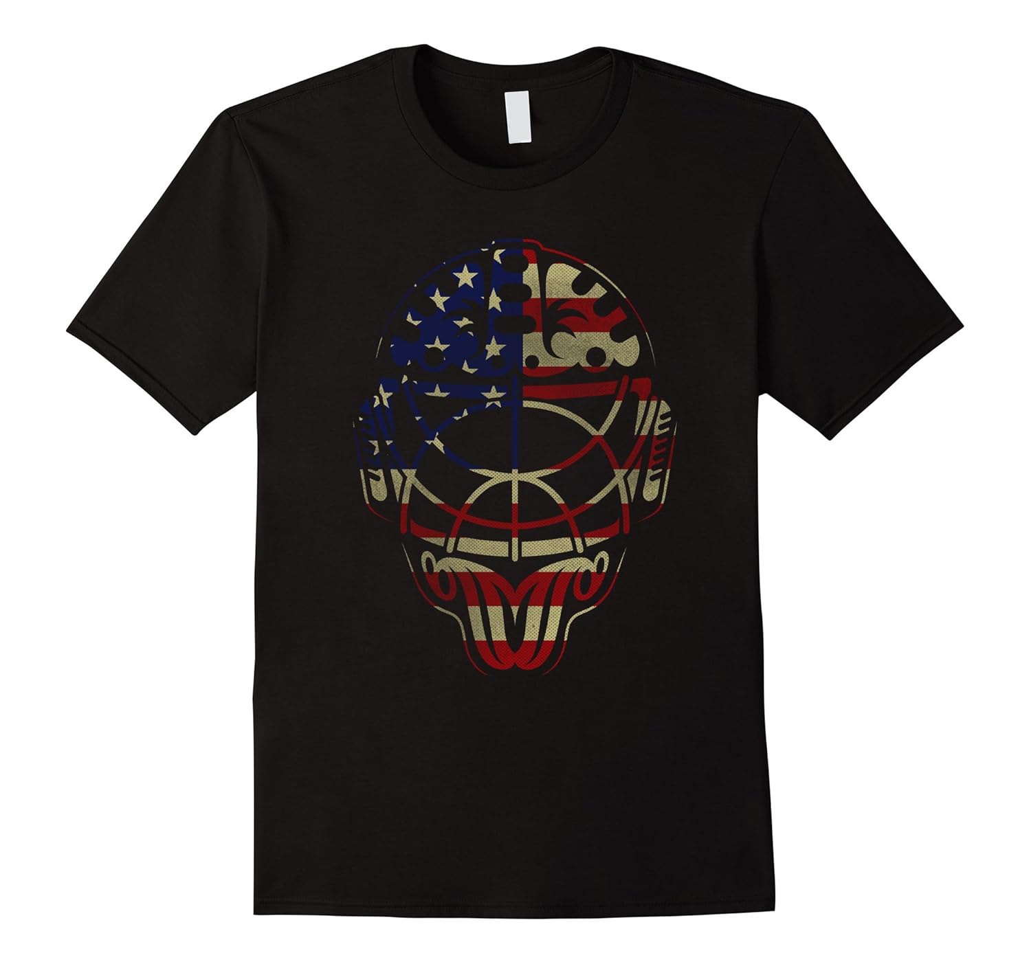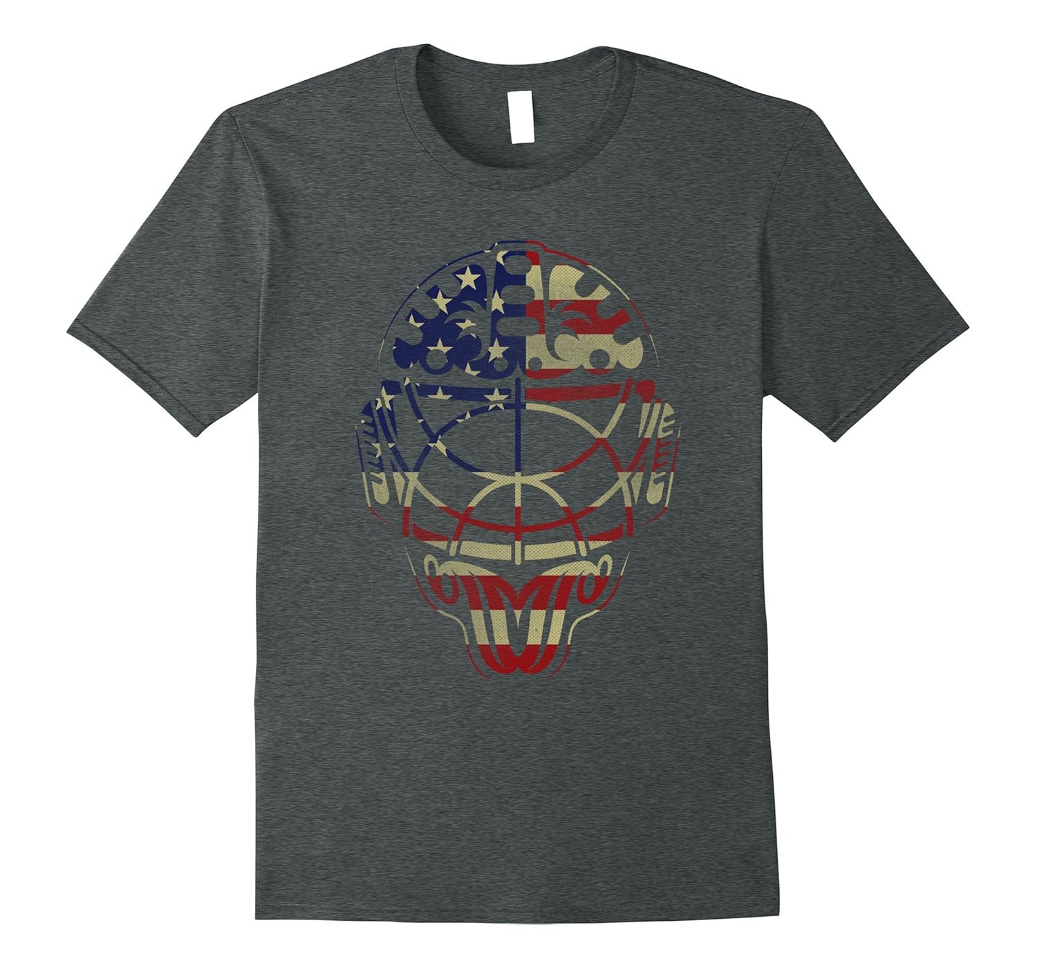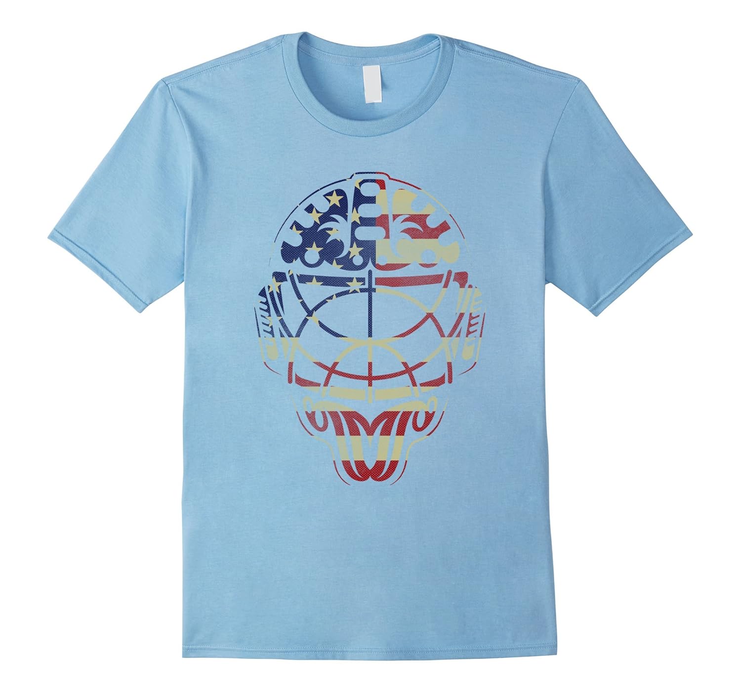Solid colors: 100% Cotton; Heather Grey: 90% Cotton, 10% Polyester; All Other Heathers: 50% Cotton, 50% Polyester; Imported; Machine wash cold with like colors, dry low heat; Vintage colors USA hockey goalie mask tshirt. Great as a birthday gift or Christmas present idea for men women adults boys girls children kids and all hockey goalies that love sleep eats stop pucks and play hockey.; United States of America flag stars and stripes goalie mask Ice hockey shirt for all hockey goalies goaltenders. Perfect gift for your dad father on fathers day, son daughter junior grandson granddaughter grandchild brother sister; Lightweight, Classic fit, Double-needle sleeve and bottom hem