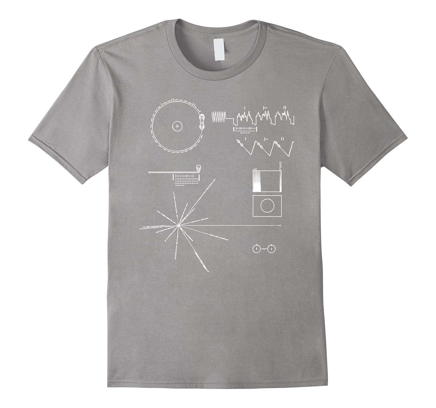Solid colors: 100% Cotton; Heather Grey: 90% Cotton, 10% Polyester; All Other Heathers: 65% Cotton, 35% Polyester, Imported, Machine wash cold with like colors, dry low heat, Voyager Golden Record t-shirt, yoyager message, Communication with extraterrestrial intelligence, Time capsule, Voyager Golden Record Message, Voyager spacecraft, Ufo, Seti, Alien, Search for extraterrestial life, Lightweight, Classic fit, Double-needle sleeve and bottom hem
