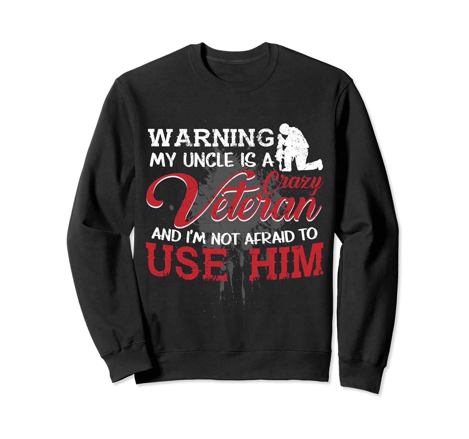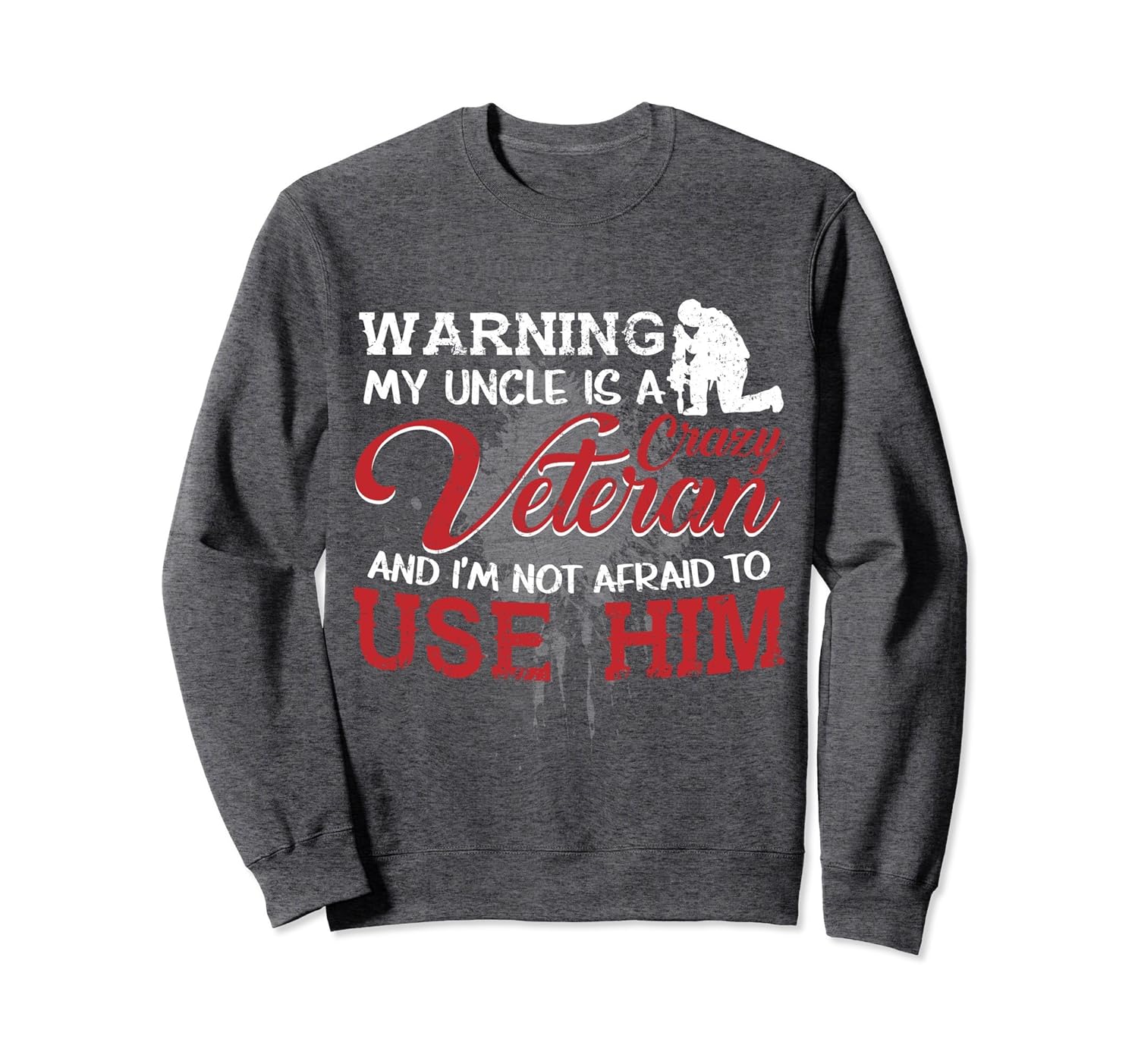 Solid colors: 80% Cotton, 20% Polyester; Heather Grey: 78% Cotton, 22% Poly; Dark Heather: 50% Cotton, 50% Polyester; Imported; Machine wash cold with like colors, dry low heat; Warning! My uncle is a crazy veteran Im not afraid to use him sweatshirt funny niece gift nephew gift; Funny Birthday Gift T-shirt for Niece, Funny Birthday Gift T-shirt for Nephew, Uncle Veteran sweatshirt for Kids, Crazy Uncle Veteran sweatshirt for Niece and Nephew, funny niece sweatshirt, funny nephew sweatshirt , funny niece sweatshirt; 8.5 oz, Classic fit, Twill-taped neck