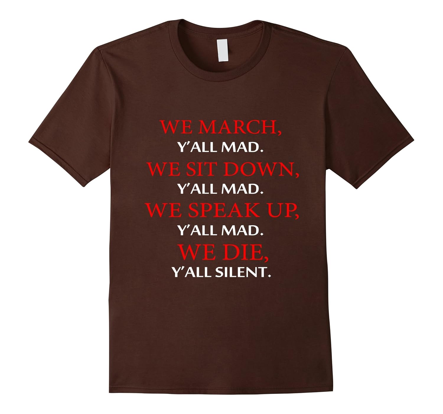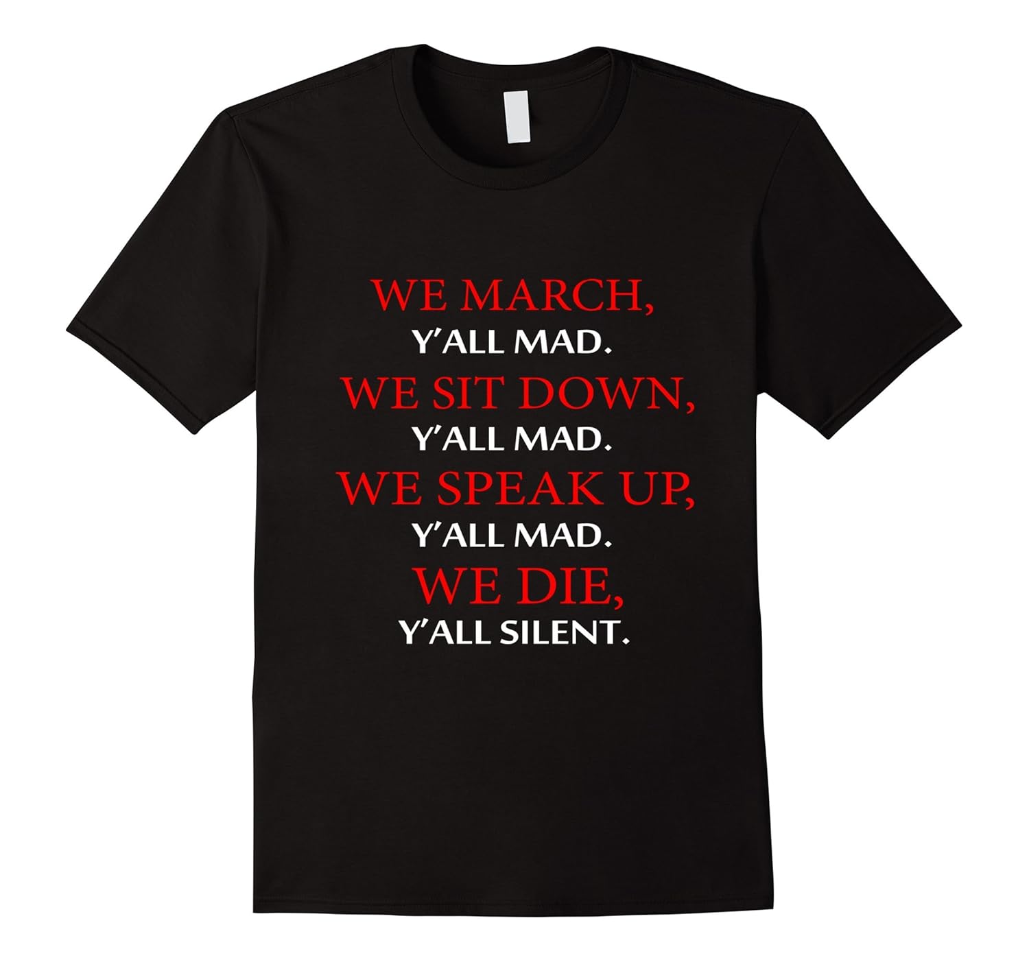 Solid colors: 100% Cotton; Heather Grey: 90% Cotton, 10% Polyester; All Other Heathers: 65% Cotton, 35% Polyester, Imported, Machine wash cold with like colors, dry low heat, We march Y”all Mad, We sit down, Y”all Mad, We speak up Y”all mad, we die Y”all silent T-shirt, Lightweight, Classic fit, Double-needle sleeve and bottom hem