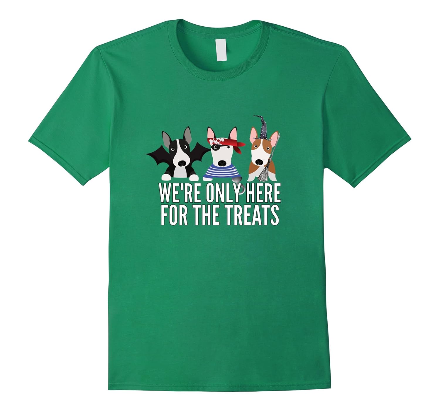 Solid colors: 100% Cotton; Heather Grey: 90% Cotton, 10% Polyester; All Other Heathers: 65% Cotton, 35% Polyester, Imported, Machine wash cold with like colors, dry low heat, The We”re Only Here For The Treats Halloween Dog T-Shirt makes the perfect dog Halloween tshirt to go trick-or-treating in this year, This English Bull Terrier Dog Halloween Shirt will have everyone smiling this Halloween, Lightweight, Classic fit, Double-needle sleeve and bottom hem