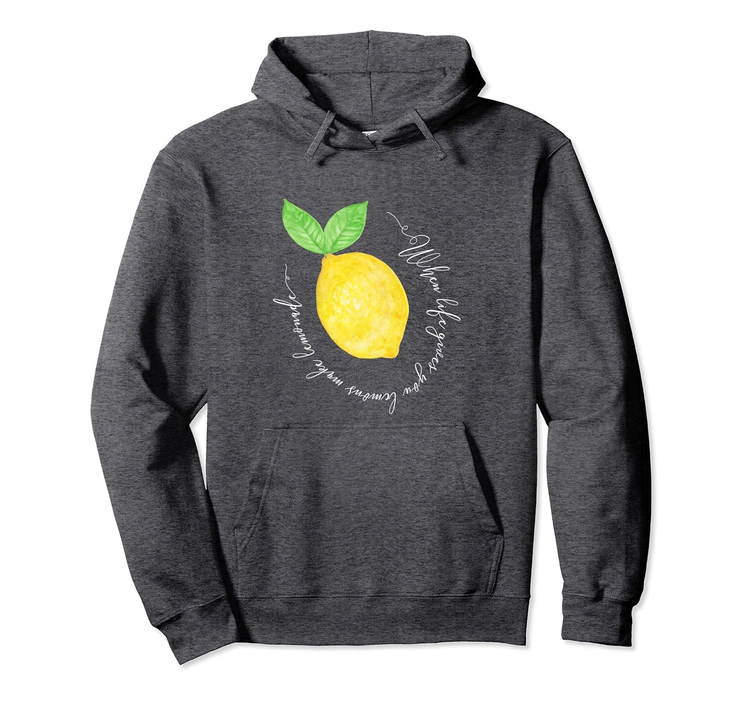 Solid colors: 80% Cotton, 20% Polyester; Heather Grey: 78% Cotton, 22% Poly; Dark Heather: 50% Cotton, 50% Polyester; Imported; Machine wash cold with like colors, dry low heat; When Life Gives You Lemons hoodie pullover. Inspirational Calligraphy, Typography Art Gift hooded sweatshirt. Funny cute, inspiring saying: When life gives you lemons make lemonade.; Fruit graphic art with positive message. Motivational, encouraging shirts make awesome gifts. Beautiful handwritten, handwriting text font. Perfect artsy birthday, christmas gift for her, women. Hooded sweat shirt.; 8.5 oz, Classic fit, Twill-taped neck
