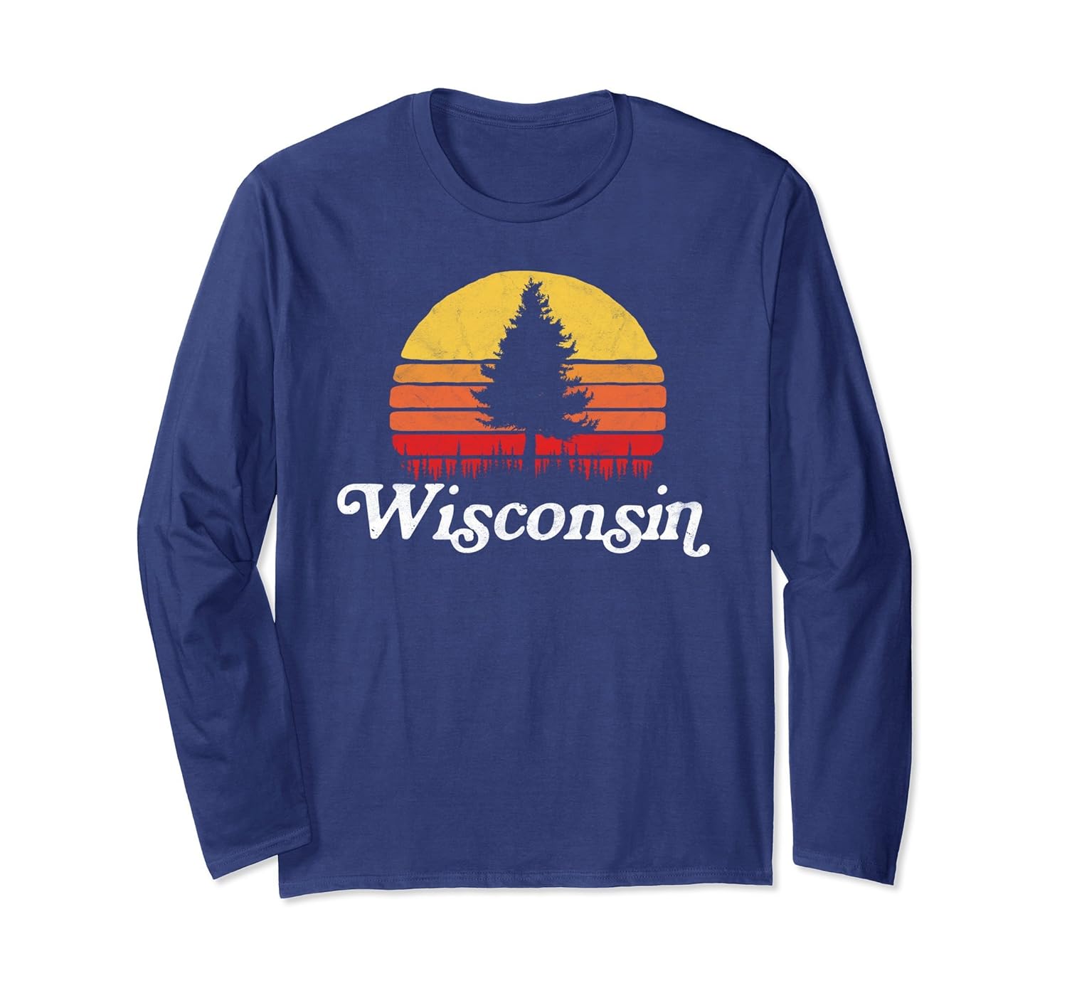 Solid colors: 100% Cotton; Heather Grey: 90% Cotton, 10% Polyester; All Other Heathers: 50% Cotton, 50% Polyester; Imported; Machine wash cold with like colors, dry low heat; Wisconsin Pine Tree Vintage Retro State Pride Nature design featuring retro sun and sunset colors and a lone, minimalist pine silhouette. Great for lovers of the outdoors and tourists and natives alike! Retro distressed vibe and lettering style font; Great outdoorsy gift for lovers of camping, hiking, exploring, the great outdoors, fishing and hunting in nature. Perfect for birthday or Christmas or graduation for nature lovers and outdoor sports enthusiasts!; Lightweight, Classic fit, Double-needle sleeve and bottom hem