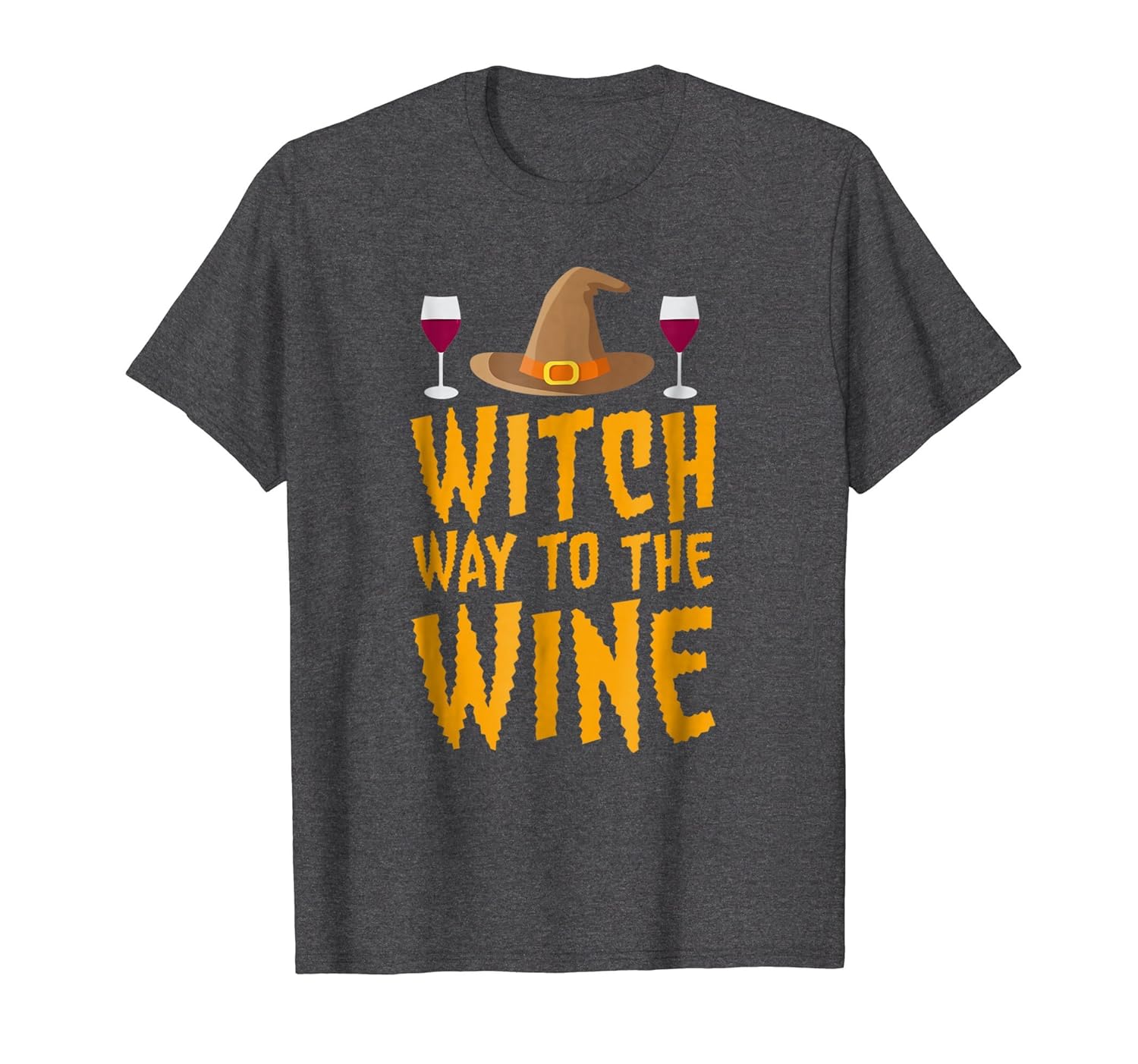 Solid colors: 100% Cotton; Heather Grey: 90% Cotton, 10% Polyester; All Other Heathers: 50% Cotton, 50% Polyester; Imported; Machine wash cold with like colors, dry low heat; This cute witch way to the wine graphic t shirt would be a cool gift idea that your dad, mom and family would love to wear while out to trick or treat on Halloween; Lightweight, Classic fit, Double-needle sleeve and bottom hem