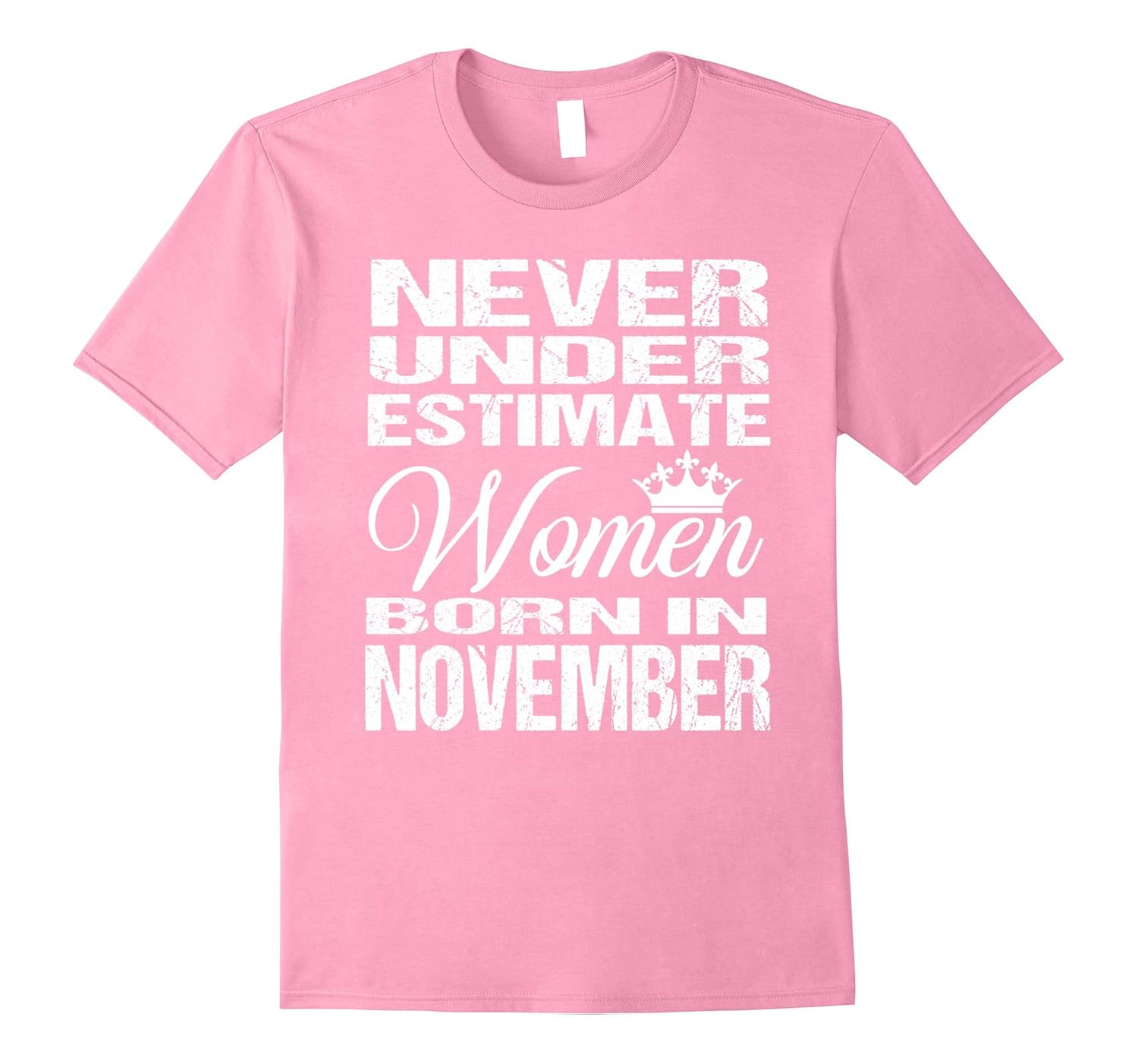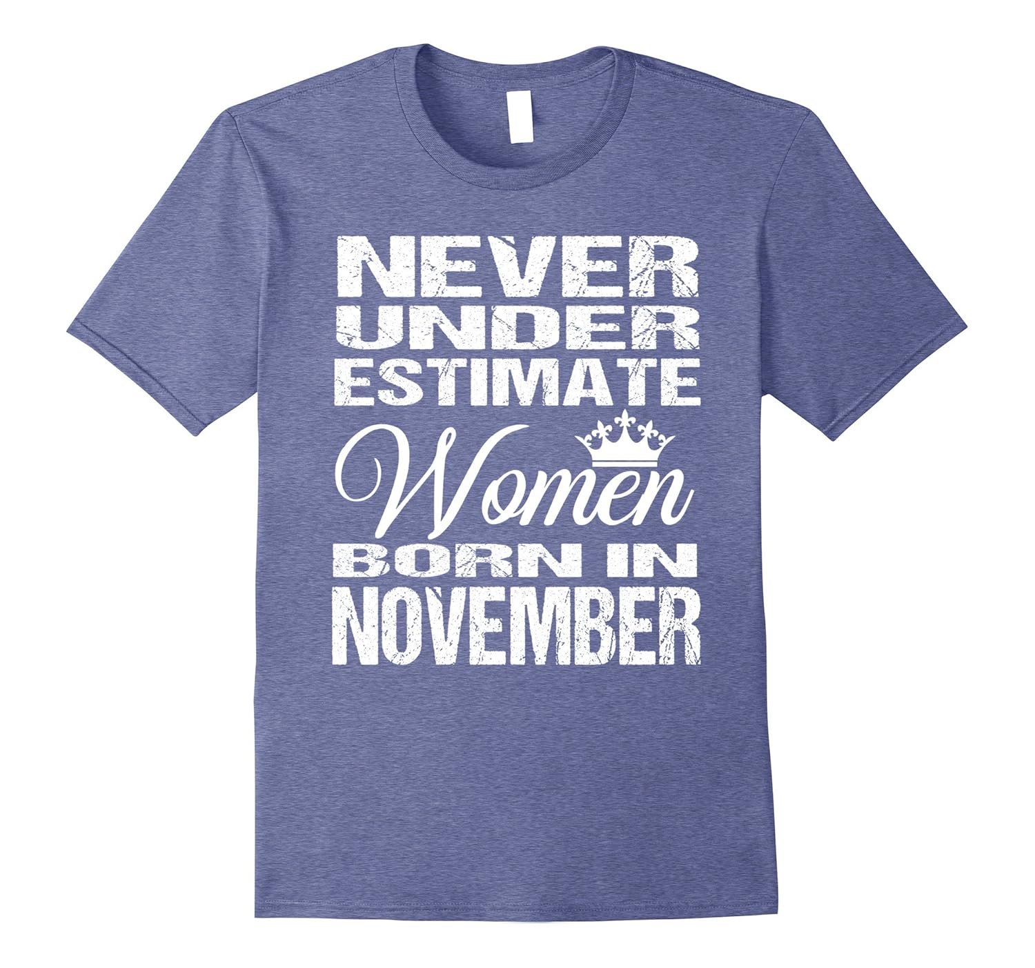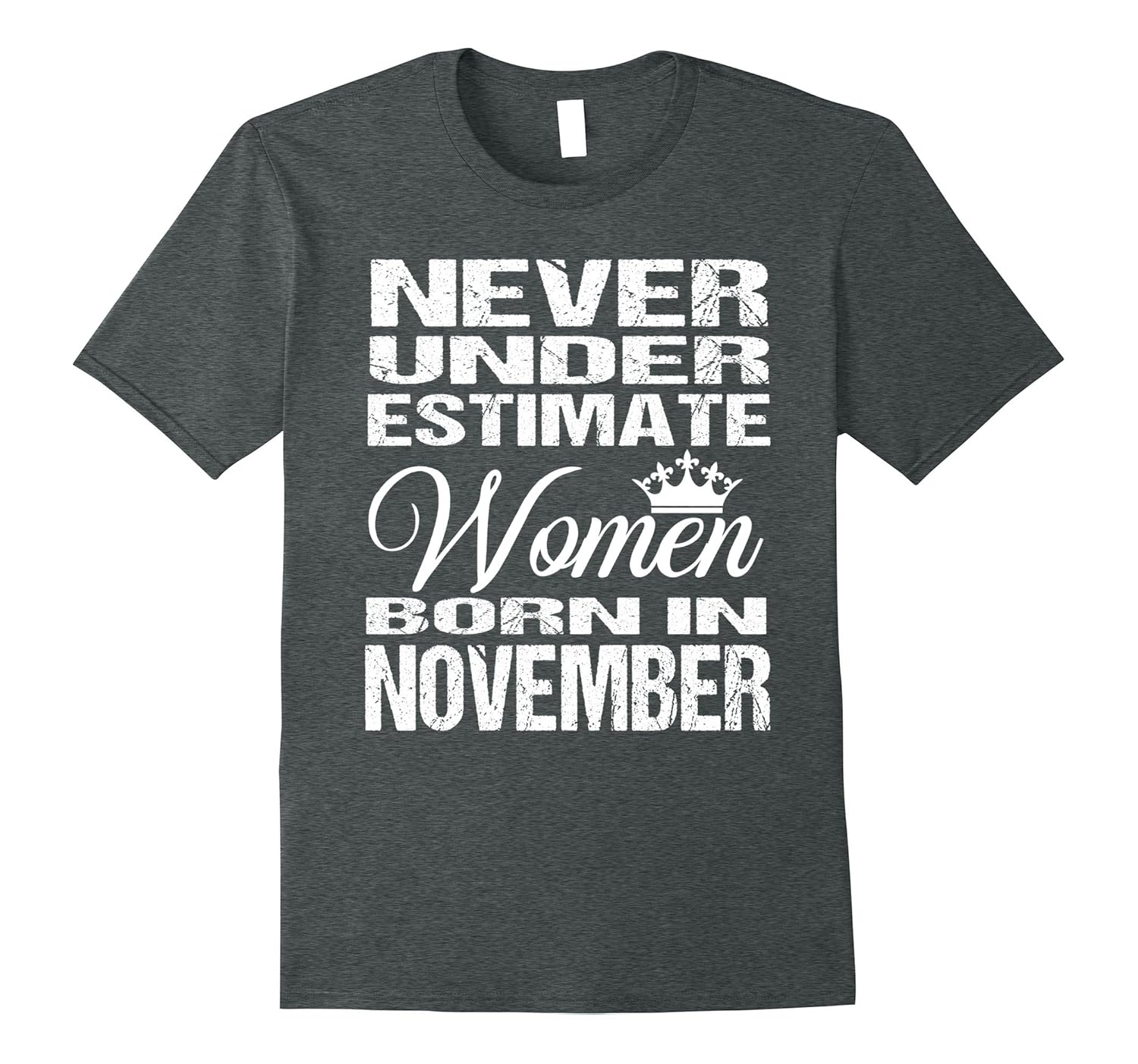 Solid colors: 100% Cotton; Heather Grey: 90% Cotton, 10% Polyester; All Other Heathers: 65% Cotton, 35% Polyester, Imported, Machine wash cold with like colors, dry low heat, NEVER UNDERESTIMATE A WOMAN BORN IN NOVEMBER TSHIRT makes a great birthday or holiday gift for any girl, lady or woman who celebrates her birthday in November. If you are a strong woman who is working toward her dreams and doesn”t want to be underestimated, wear this stylish Born in November TShirt to let the world know!, Lightweight, Classic fit, Double-needle sleeve and bottom hem