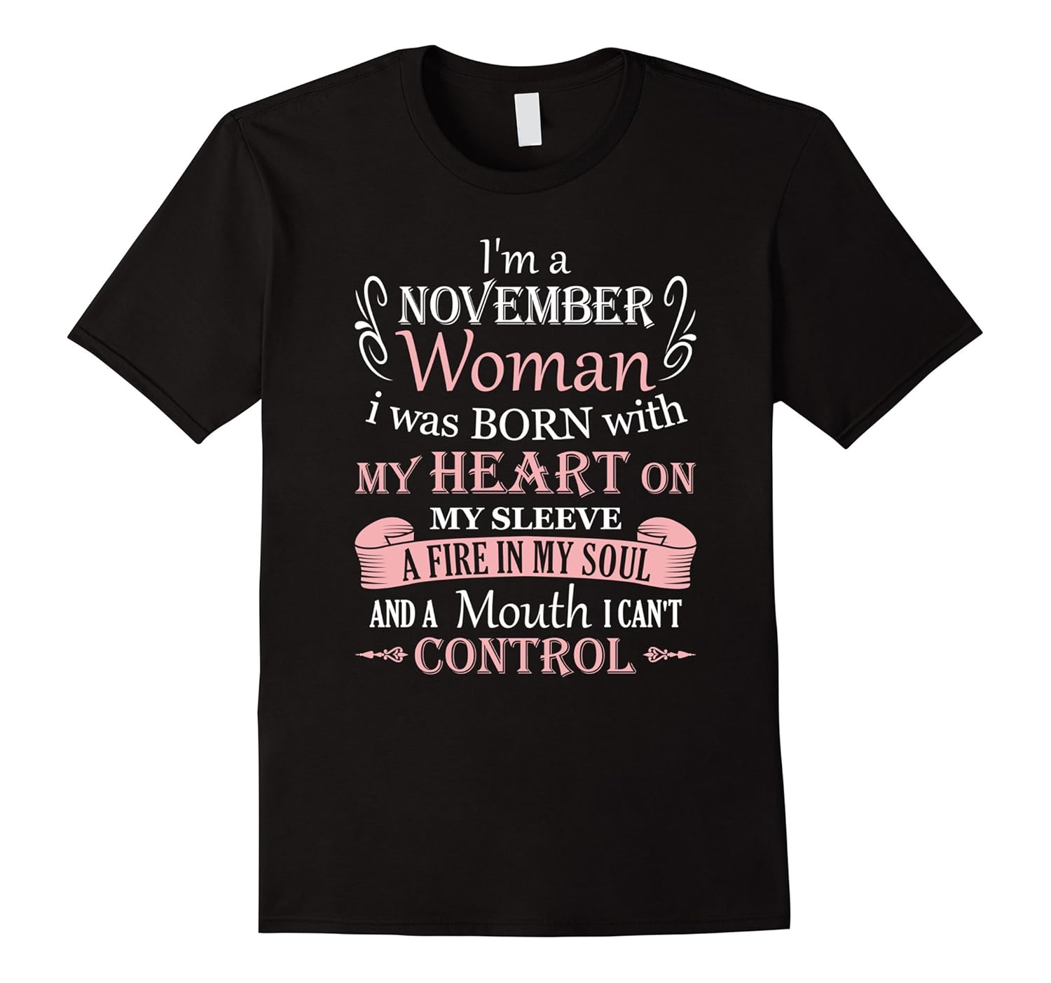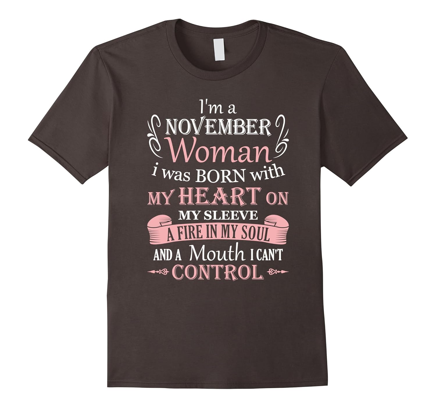 Solid colors: 100% Cotton; Heather Grey: 90% Cotton, 10% Polyester; All Other Heathers: 65% Cotton, 35% Polyester, Imported, Machine wash cold with like colors, dry low heat, I”m a November Woman I Was Born With My Heart On My Sleeve a Fire In My Soul and a Mouth I Cant Control T-Shirt for women born in November is an awesome birthday T-Shirt gift idea for every girl and woman. So if you”re struggle to find an awesome birthday tee shirt present for your female friend then this very nice tee is for you. Live this shirt and want same for a person born in a different month – click on the brand name: Super Cute Birthday Gifts Woman, Your wife, girlfriend, mother or sister is a November Woman because she was born in November month and now you want to make something special to give her on her celebration of a Birthday then this adorable women”s shirt is perfect for her. Make her feel great about herself because of such a nice saying on this super cute t-shirt for girls born in November. Lightweight, Classic fit, Double-needle sleeve and bottom hem