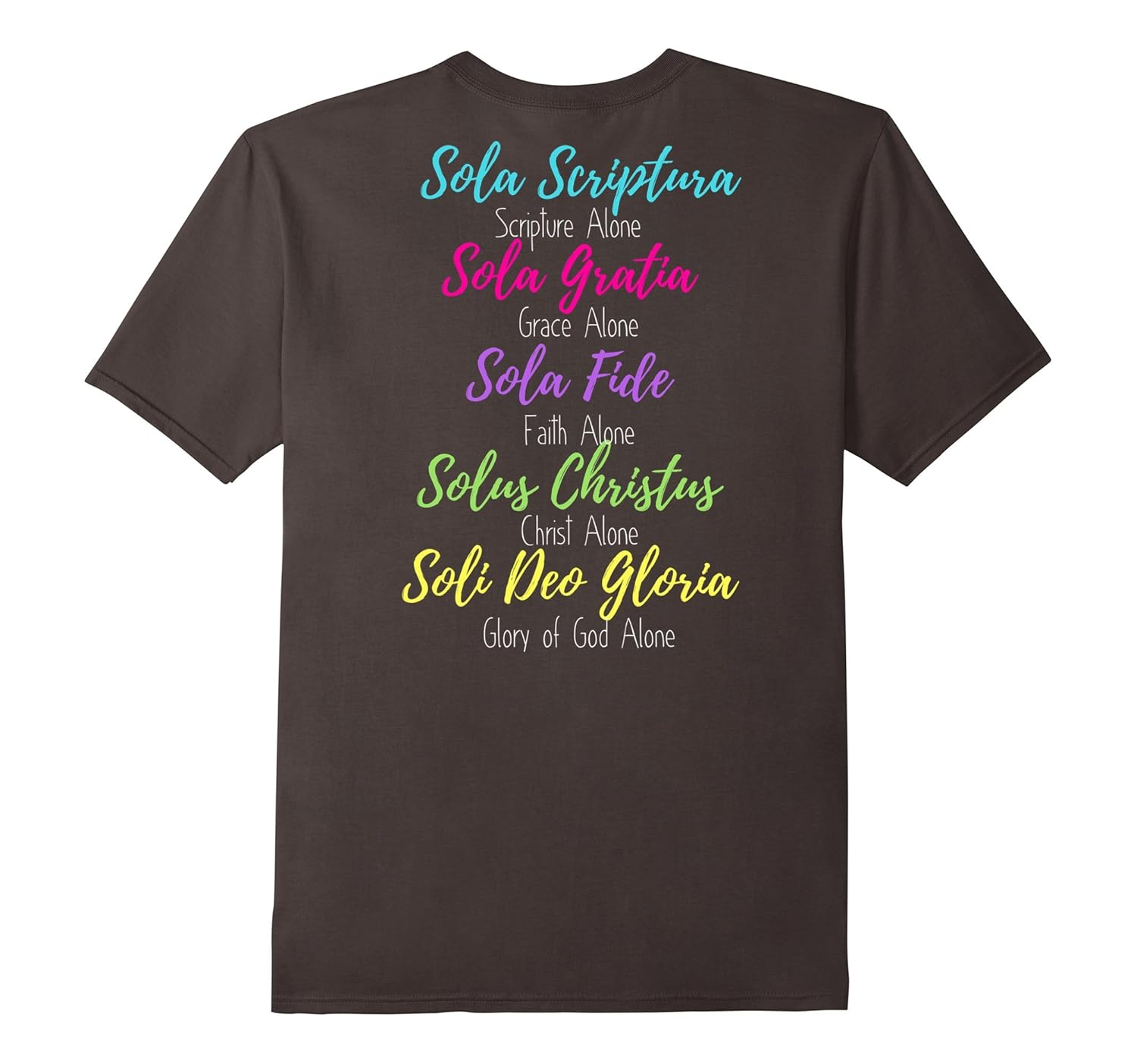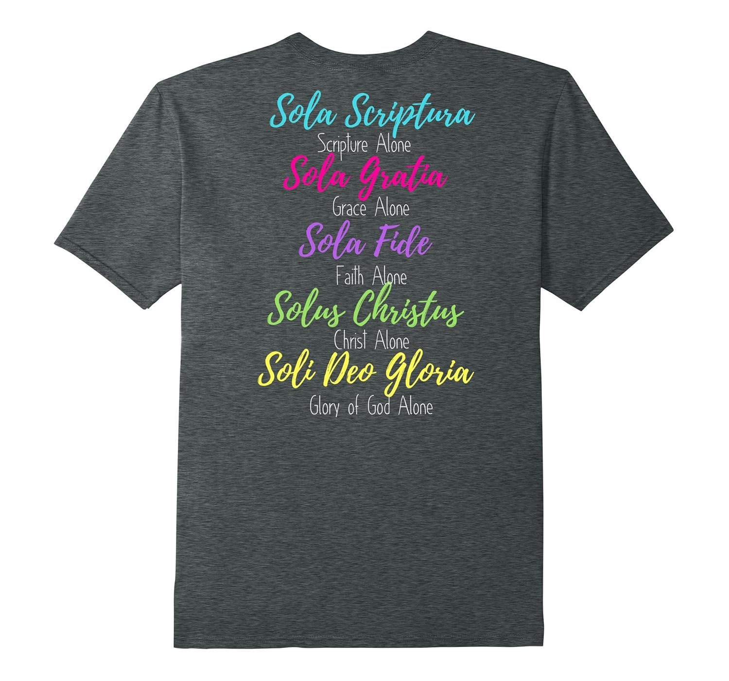 Solid colors: 100% Cotton; Heather Grey: 90% Cotton, 10% Polyester; All Other Heathers: 65% Cotton, 35% Polyester, Imported, Machine wash cold with like colors, dry low heat, Great t-shirt for women featuring colorful print of the 5 Solas of the Reformed Faith. Makes a great Christmas or birthday gift. Reformation Day 500 Year Anniversary Soli Deo Gloria Reformed Martin Luther October 31 Halloween Church Praise and Worship Ministry, Lightweight, Classic fit, Double-needle sleeve and bottom hem