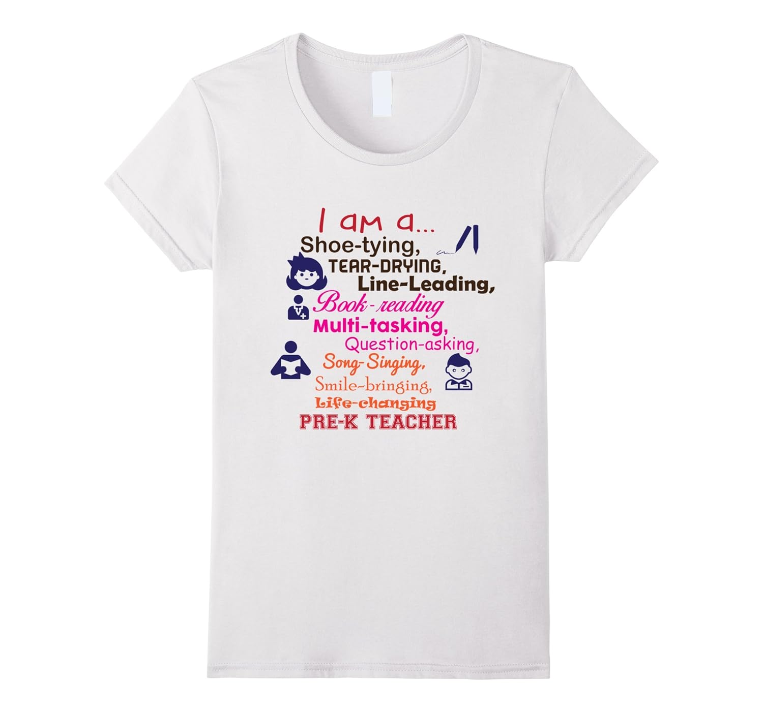 100% Cotton; Imported; Machine wash cold with like colors, dry low heat; Im a Shoe-tying, Tear-Drying, Line-Leading, Book-reading, Multi-tasking, Question-asking, Song-Singing, Smile-bringing, Life-changing PRE-K TEACHER; PRE-K Teachers do it all and have so many roles to play that often get overlooked; Lightweight, Classic fit, Double-needle sleeve and bottom hem