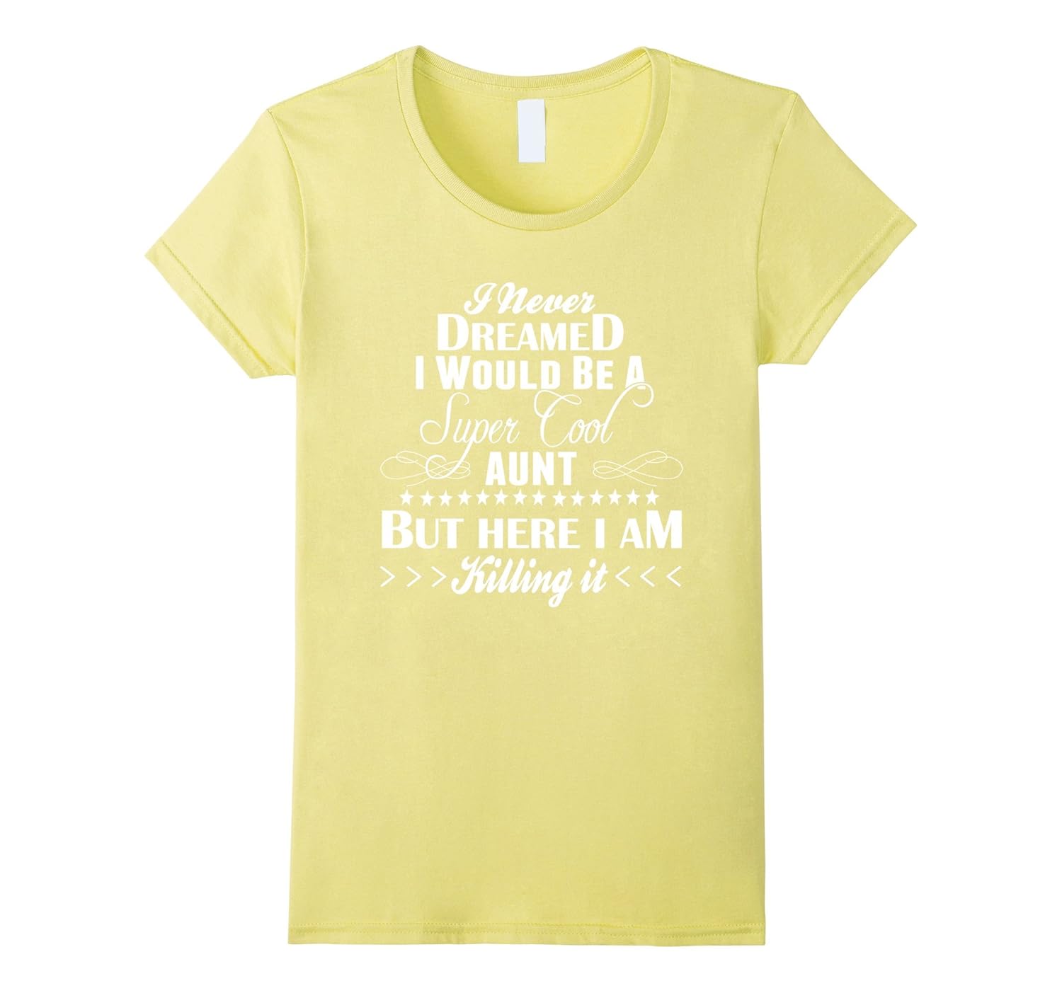 Solid colors: 100% Cotton; Heather Grey: 90% Cotton, 10% Polyester; All Other Heathers: 65% Cotton, 35% Polyester; Imported; Machine wash cold with like colors, dry low heat; Super Cool Aunt Killing It TShirt is designed to fit. For a looser fit order a size up.; I never dreamed I would be a SUPER COOL AUNT but here I am killing it! If you have a brand new sweet little nephew or niece – you might be new to the Aunt game. Step up and be the coolest Auntie around! Great gift tee for a new Aunt!; Lightweight, Classic fit, Double-needle sleeve and bottom hem