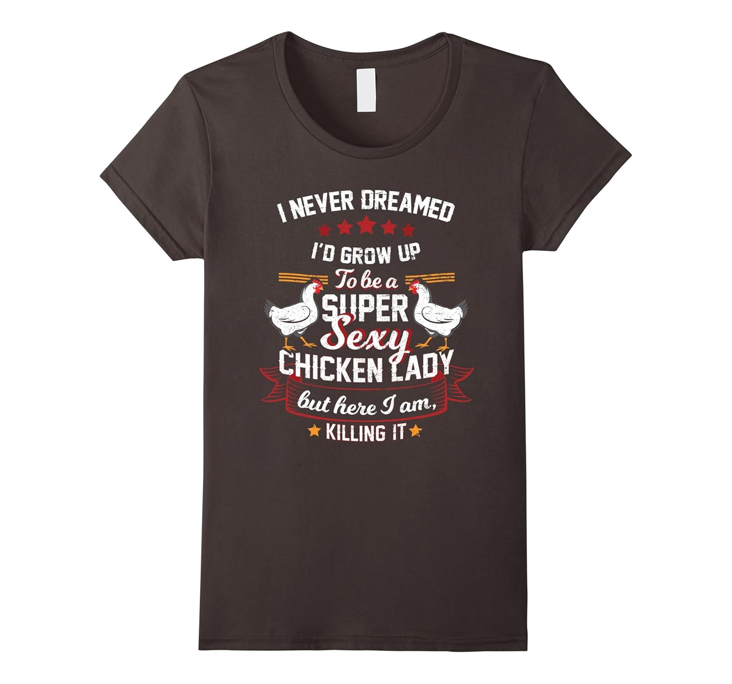 Solid colors: 100% Cotton; Heather Grey: 90% Cotton, 10% Polyester; All Other Heathers: 65% Cotton, 35% Polyester, Imported, Machine wash cold with like colors, dry low heat, I Never Dreamed I”D Grow Up To Be A Super Sexy Chicken Lady But Here I Am Killing It T-Shirt, Lightweight, Classic fit, Double-needle sleeve and bottom hem