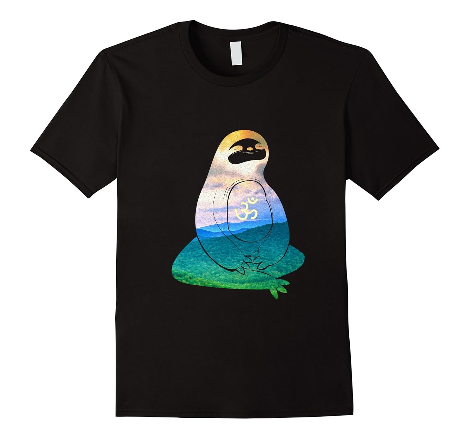 Solid colors: 100% Cotton; Heather Grey: 90% Cotton, 10% Polyester; All Other Heathers: 65% Cotton, 35% Polyester, Imported, Machine wash cold with like colors, dry low heat, Features Sloth meditating, Features Om symbol, Lightweight, Classic fit, Double-needle sleeve and bottom hem