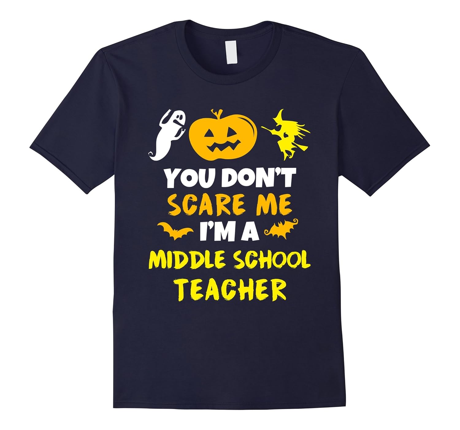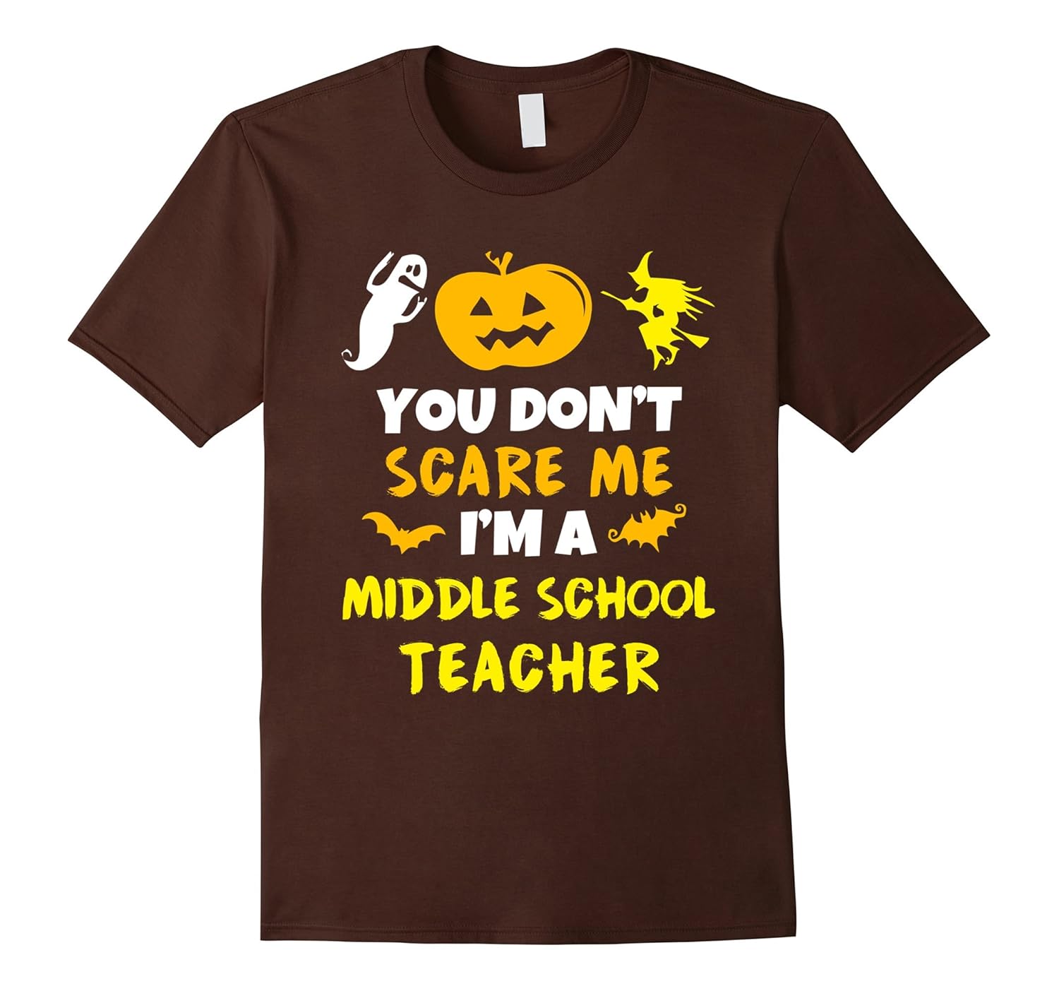 Solid colors: 100% Cotton; Heather Grey: 90% Cotton, 10% Polyester; All Other Heathers: 65% Cotton, 35% Polyester; Imported; Machine wash cold with like colors, dry low heat; you dont scare me im a middle school teacher school education educator halloween party happy scary witch pumpkin ghost ghoul horror. cant wait to wear this!; quote textual saying cool gift ideas joke funny humor sarcastic; Lightweight, Classic fit, Double-needle sleeve and bottom hem