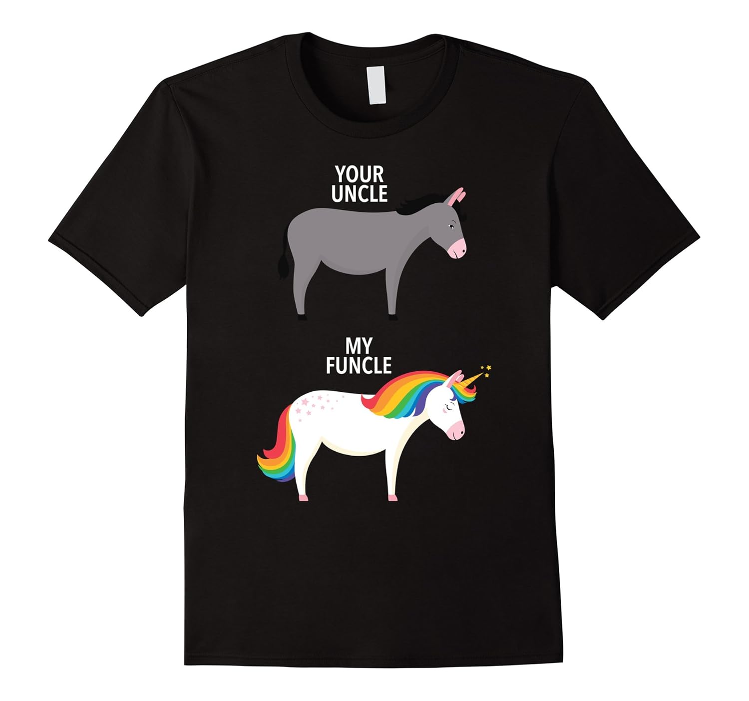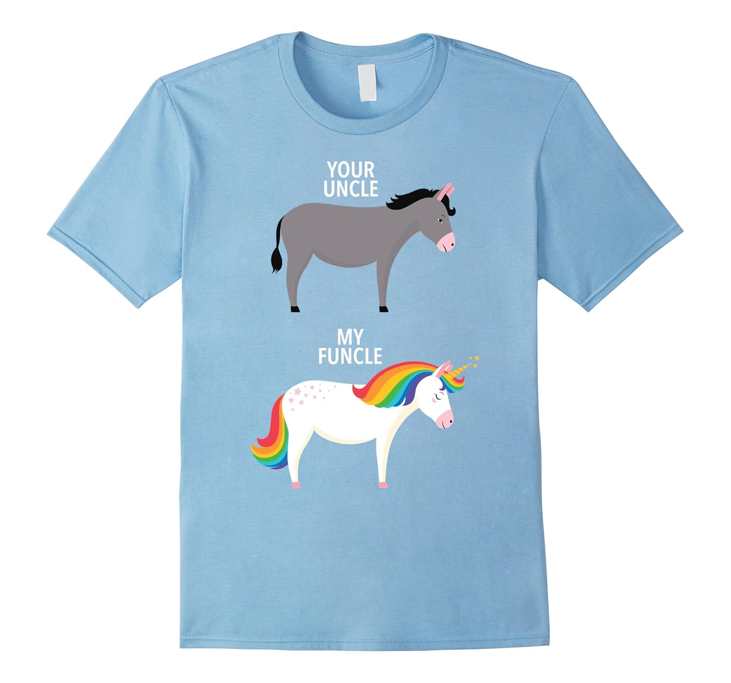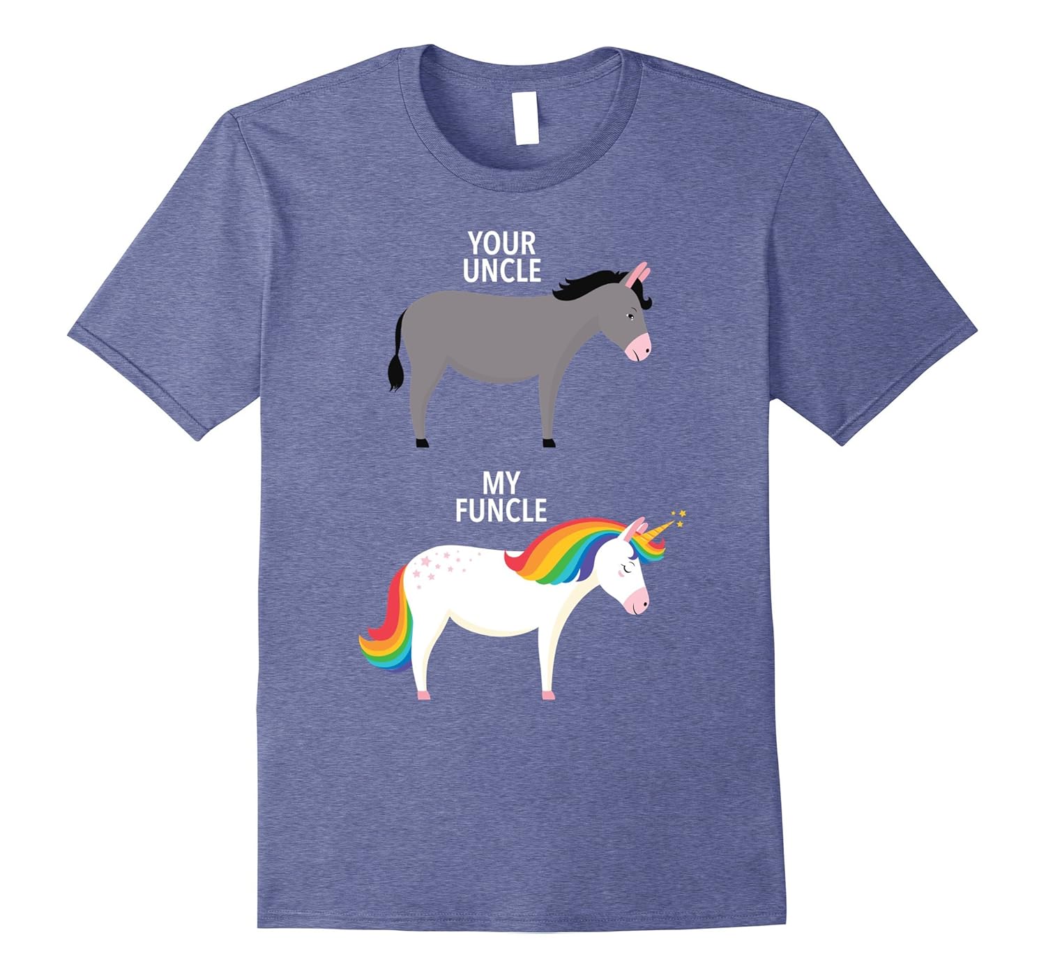 Solid colors: 100% Cotton; Heather Grey: 90% Cotton, 10% Polyester; All Other Heathers: 65% Cotton, 35% Polyester, Imported, Machine wash cold with like colors, dry low heat, Funny Donkey VS Unicorn T-Shirt Design. If you have a funny Uncle this is a great purchase for you. Great gift idea for a niece or nephew so they can show off their funcle. All ages, family friendly adorable design. Hand illustrated original graphic shirt. This original unicorn fun uncle design is printed on a fitted shirt, order one size up for a looser fit. Fantasy rainbow unicorn character and a sad donkey. Boost about your loving uncle that spoils you. Proud family graphic t-shirt apparel, sweet and fun. Lightweight, Classic fit, Double-needle sleeve and bottom hem